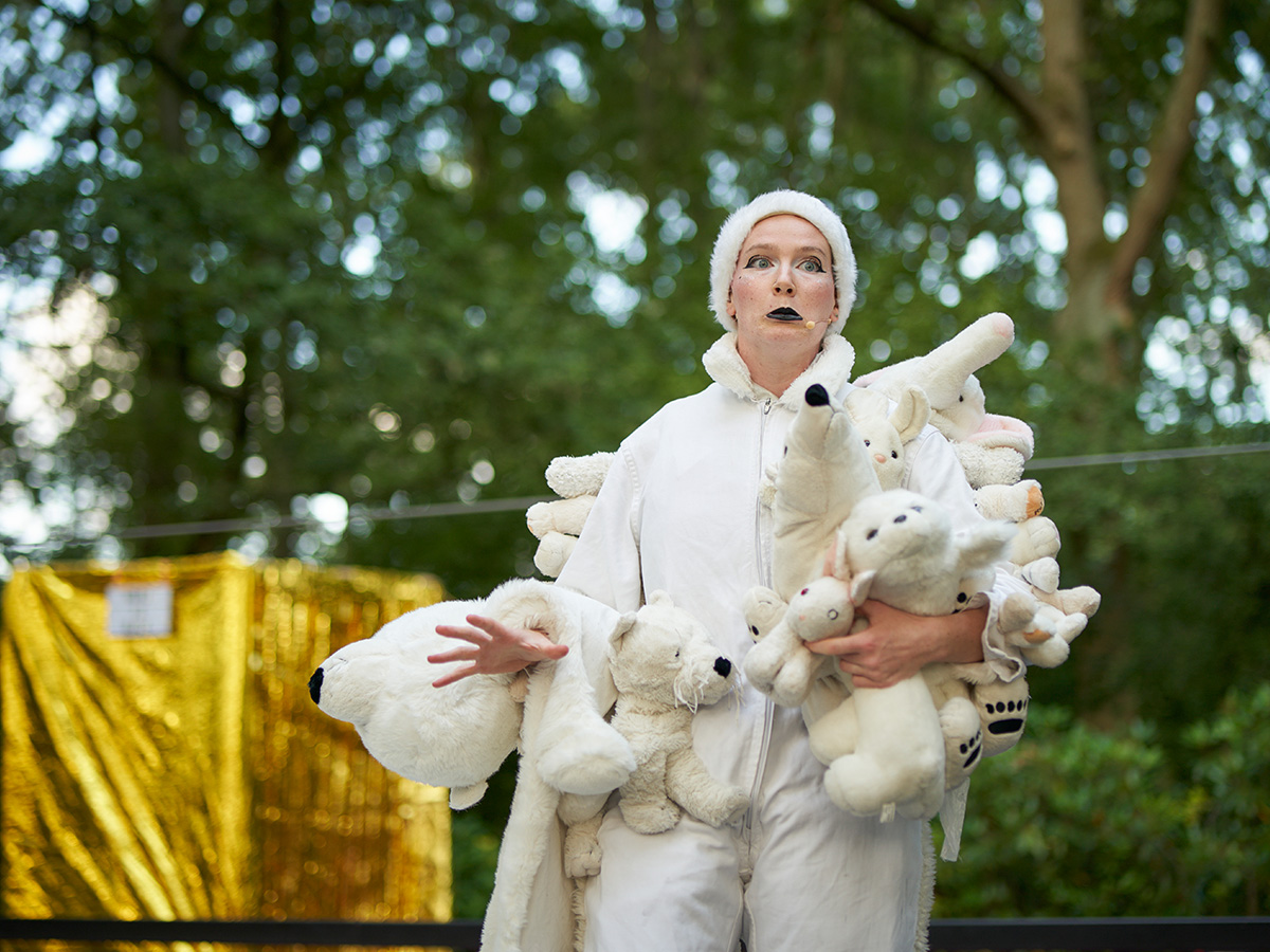 Ze is een popster gekleed in knuffels. Kwetsbaar en glamoureus.